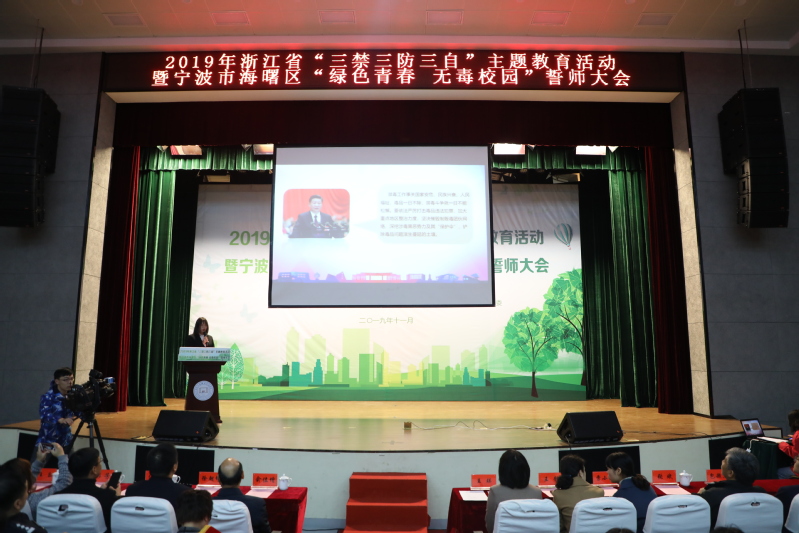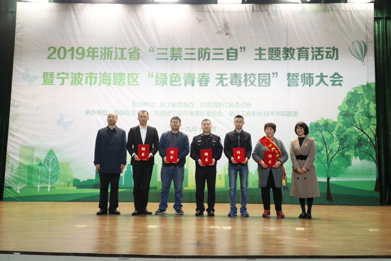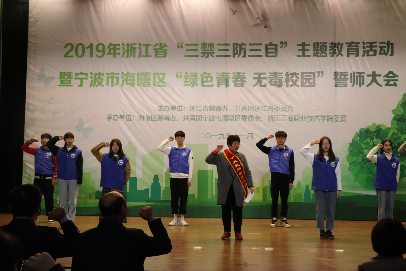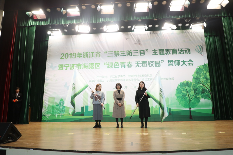 祖国有我,禁毒有我。11月27日下午,2019年浙江省“三禁三防三自”主题教育活动暨宁波市海曙区“绿色青春 无毒校园”誓师大会在我校博学楼报告厅举行。团省委志工权益部副部长王瑛,校党委副书记俞位增,团市委青少年社会参与和权益维护部部长王静,海曙区禁毒大队教导员徐朝坤,海曙团区委副书记曹小波、包超杰,以及宁波财经学院等兄弟院校团委负责人,我校学工部、团委、保卫处负责人,辅导员、学生代表等出席活动。本次活动由浙江省禁毒办、团省委主办,海曙区禁毒办、海曙团区委、校团委承办。