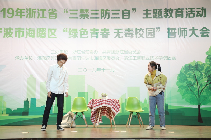 我校“青少年禁毒护航计划”志愿服务项目负责人蔡乐意同学作“绿色青春 无毒校园”公益项目路演,介绍了项目建设情况和成果,该项目曾获浙江省第三届妇女儿童公益服务项目创意大赛三等奖。清水话剧社的同学们为在场的观众带来了禁毒宣传情景剧《梦醒时分》,通过艺术的表现形式展现了毒品的危害,奏响了“珍爱生命 远离毒品”的禁毒主旋律,赢得了阵阵掌声。