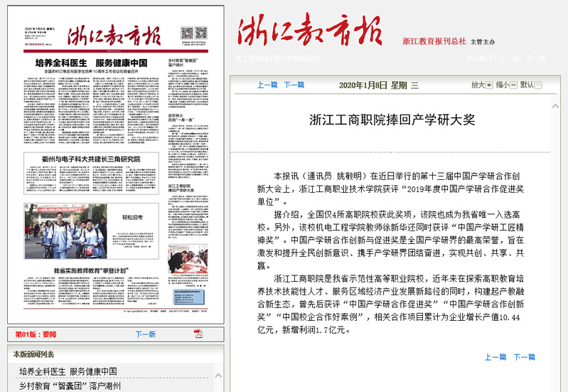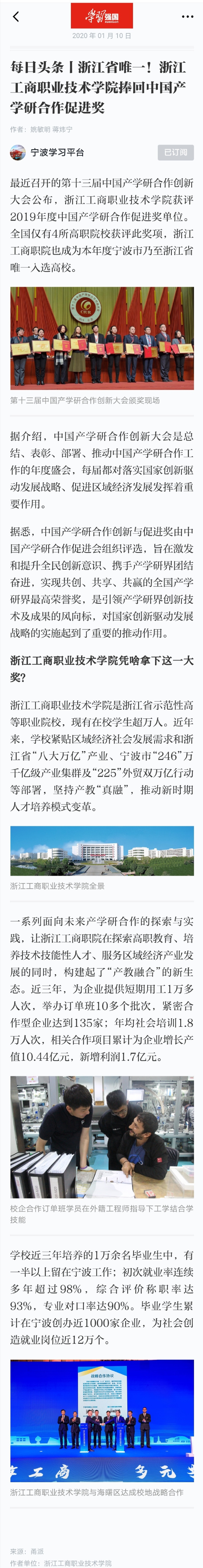 2020年1月10日,学习强国平台刊登了《浙江省唯一!浙江工商职业技术学院捧回中国产学研合作促进奖》一文,报道了我校以产学研合作为突破口,紧贴区域经济社会发展需求推动人才培养模式变革、创新产教融合机制,获评2019年度中国产学研合作促进奖单位的内容。在此之前,《浙江教育报》头版、《浙江工人日报》职业教育版、《宁波日报》要闻版,以及甬派客户端、中国教育在线、凤凰网宁波等媒体也相继报道相关内容,引起社会广泛关注,扩大了学校的美誉度和影响力,也为我校在新时代背景下,深入推进产教融合,不断提升办学水平,主动探索服务区域经济产业发展的新路径营造了积极振奋的舆论氛围。