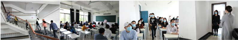 场景二中启动了教学区网格管理方案,演练学生上课、学生上厕所等管理。在上课过程中,5号班级发现1名学生体温异常,上课老师报告学院负责学生工作领导,最后报至学校疫情防控工作领导小组,并启动紧急预案。异常人员与其他人员保持安全距离,由辅导员带至学校医务室,医务人员测量体温后决定处置方法。该班级其他人员暂留原地,等待应急预案演练结束。