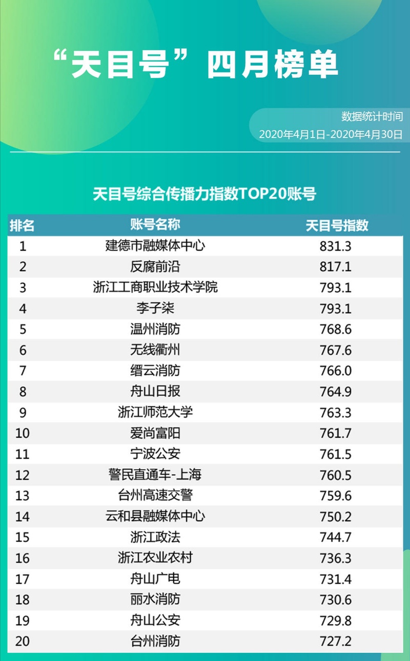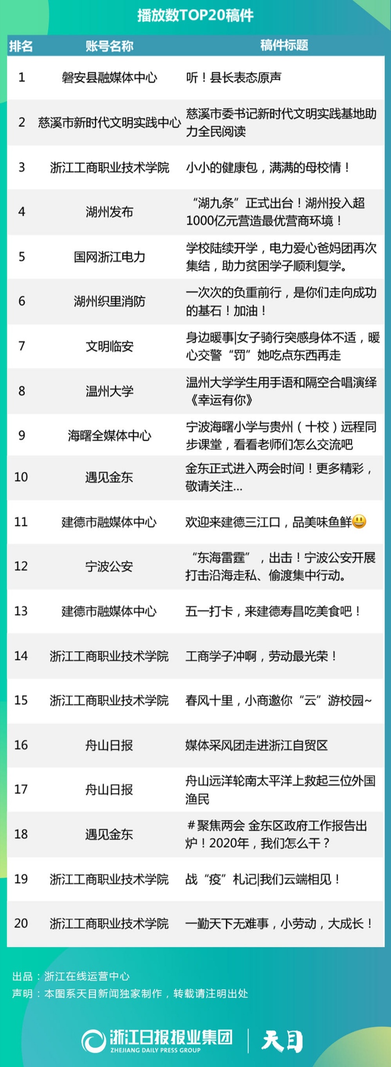 近日,天目新闻客户端发布“天目号”四月榜单,我校官方天目号入选综合力传播指数TOP20,位列第三名,总发稿数TOP20,位列第七名,播放数TOP20稿件中,我校占5条。