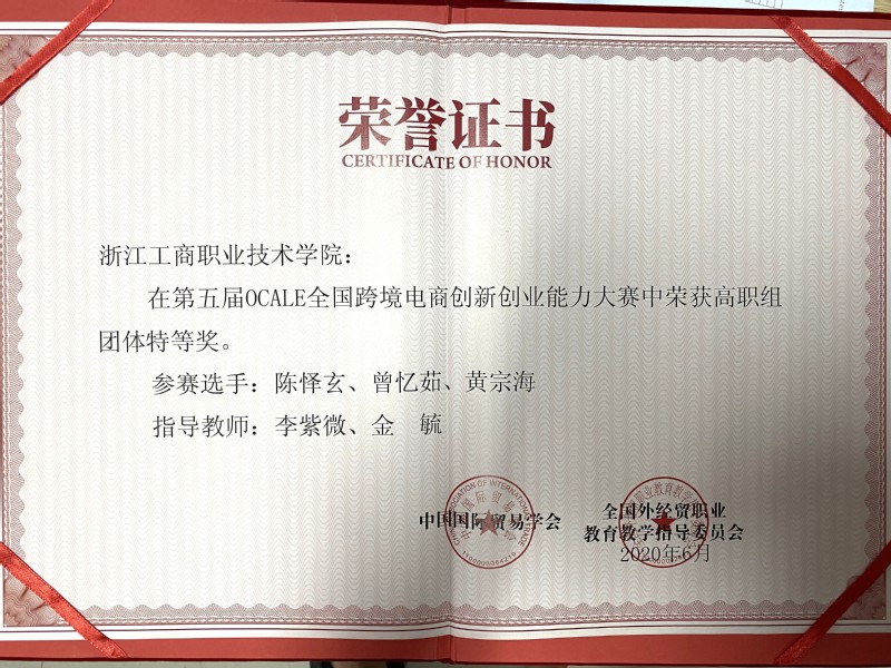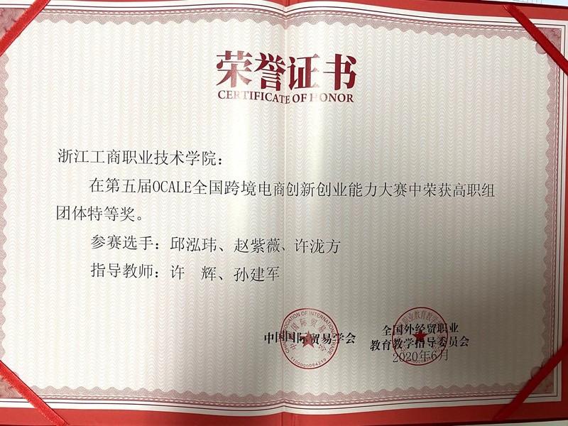 近日,第五届OCALE全国跨境电商创新创业能力大赛落下帷幕,我校电子商务学院选派的7支代表队凭借优异的表现,夺得了2个团体特等奖和2个团体一等奖、1个团体二等奖和2个团体三等奖的骄人赛绩。其中邱泓玮、赵紫薇、许泷方同学(指导教师许辉、孙建军)组成的参赛队和黄宗海、陈怿玄、曾忆茹同学(指导教师李紫微、金毓)组成的参赛队获得了全国总决选的最高奖项团体特等奖。由陈静红、周锡飞老师指导的参赛队获得了团体一等奖;由章翰老师指导的参赛队获得了团体二等奖;由李明芳、濮佳妍指导的参赛队获得了团体三等奖。
