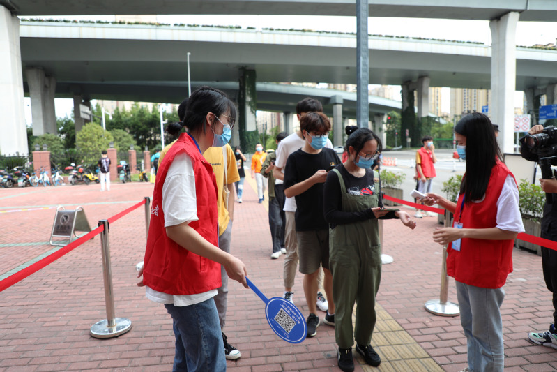 在体温检测区,一名体温检测高于或等于37.3℃的“新生”被保安迅速带至临时留观处,医务人员详细询问该生的流行病史信息后,并对其进行体温复测。复测后,显示体温正常,该名“新生”由志愿者带领入校进行后续报到流程。