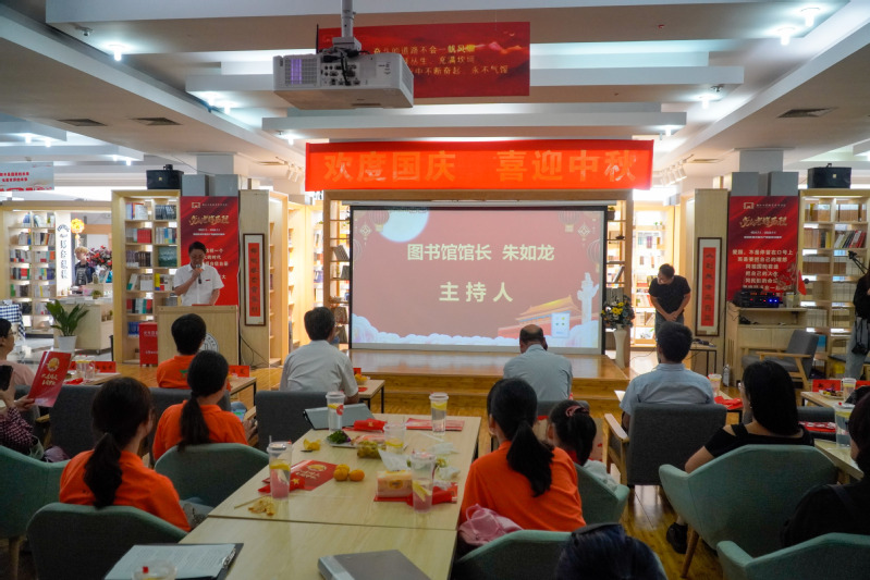 学校党委副书记俞位增代表学校致辞,指出今年国庆节与中秋完美汇合,师生同庆恰逢其时。他认为,高校应该通过中国传统节日庆祝、文化交流活动的举办等途径和手段,凝聚人心,引导大学生重新认识中华优秀传统文化的现代价值,以增强文化定力,进一步推进中华优秀传统文化传承和创新。他希望学校图书馆能够不断创新,努力挖掘和拓展文化传承职能,推动校园文化发展,拓展公共文化服务领域。海曙区图书馆馆长汪岚在致辞中向与会人员致以诚挚的谢意和节日的问候,表示将持续推进两馆资源共享、优势互补,共促协同发展。