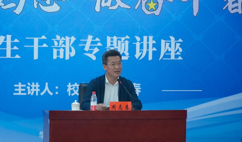 周志春以“立鸿鹄志 做奋斗者”为主题,以学生干部的责任担当为主线,围绕“当前国内外形势”、“学校近期主要工作”、“当好学生干部”三个方面,与同学们交流经验、分享感悟。他通过分析“中美关系”、“国内外经济发展趋势”、“国内就业形势”等时事热点问题,深入浅出地讲解了中国特色社会主义制度地优越性和国家治理体系和治理能力现代化的重要意义;结合学生所学专业,从“粮食进口”、“猪肉供给”、“投资行为”、“消费行为”等民生实事着眼,与同学们亲切互动、交流体会。他还详细介绍了学校今年在疫情防控、三教改革、现代学徒制、学生食堂用餐补助、体育教学改革、优质校建设推进情况等与学生息息相关的工作中所取得的成绩。他强调,学生干部是联系学校、教师与学生的桥梁和纽带,是学校和教师的重要助手,希望广大学生干部牢固树立“四个意识”,坚定“四个自信”,做到“两个维护”,为推动学校高质量发展贡献青春力量。他对广大学生干部提出了三点要求:一是充分发挥学生干部的先锋模范作用,热情关心青年、主动帮助青年、悉心服务青年;二是要牢固树立服务意识,时刻关注班级动态,尊重同学、团结同学,帮助同学反映诉求、解决难题;三是要明确角色定位,把学生干部岗位作为提升政治素养、锻炼工作能力的重要平台,一手抓理想信念,一手抓学习成绩,做到学习、工作两不误。
