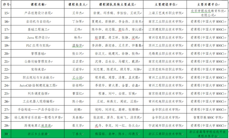 近日,教育部公示了2020年国家精品在线开放课程(高职)认定结果,全国共99门课程通过认定,我校丁春文老师领衔的《浙江乡土旅游》(团队主要成员熊国铭、姜坤、陈乡、邱德玉)课程位列其中。