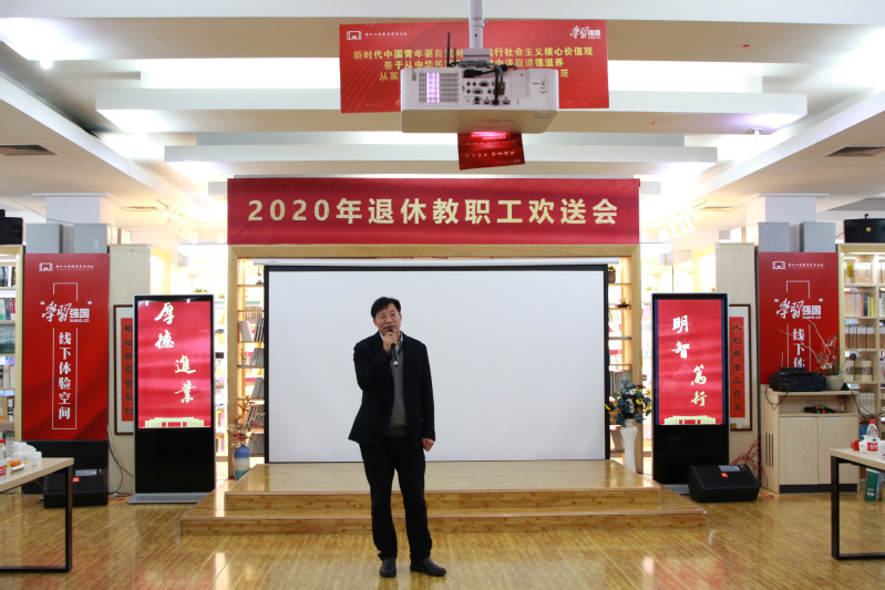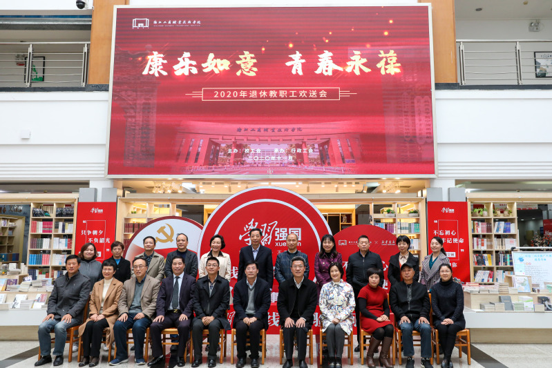11月26日下午,学校在图书馆一楼大厅隆重举办 “康乐如意·青春永葆” 2020年退休教职工欢送会,党委书记陈仕俊、校长周志春、工会主席谢骏等领导出席欢送会,2020年退休的郭聪聪、王怀奥、徐水、邱德玉等8位老师以及相关部门负责人、在职教职工代表等50多名师生参加了欢送会,本次活动由校工会主办、行政分工会承办。