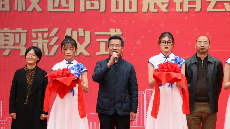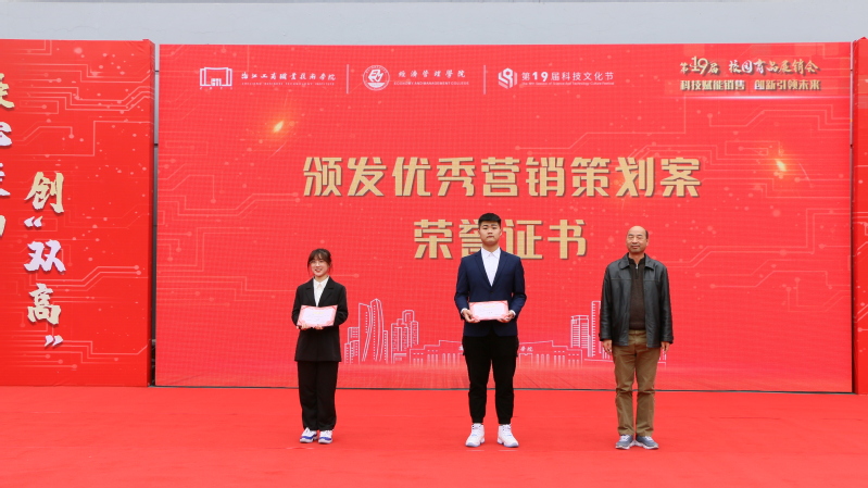 随后校领导为本届商品展销会优秀营销策划案获奖学生颁发了荣誉证书,并和主办、承办、协办部门负责人一同上台参加剪彩仪式。周志春校长宣布第十九届校园商品展销会开幕。