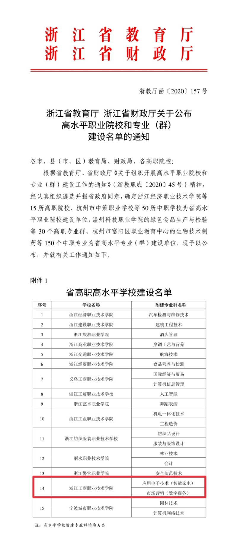 日前,浙江省教育厅、浙江省财政厅发布《关于公布高水平职业院校和专业(群)建设名单的通知》(浙教厅函[2020]157号),确定15所高职院校、50所中职院校为浙江省高水平职业院校建设单位。其中,我校获批为省高水平职业院校建设单位,附建应用电子技术(智能家电)、市场营销(数字商务)专业群两大高水平专业群(均为A类专业)。