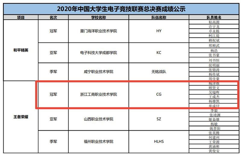 2020年11月15日-2021年1月15日,首届中国大学生电竞联赛(CUEA)在线上举行。经过两个月的激烈角逐,王者荣耀总决赛于1月15日正式拉开战幕,最终,我校以2:1战胜山西职业技术学院,勇夺首届中国大学生电竞联赛(CUEA)全国总冠军,队员杨雄凯以决赛三局未丢一分荣获最有价值选手(MVP)称号。另一项和平精英比赛项目摘夺全国第五名的佳绩。