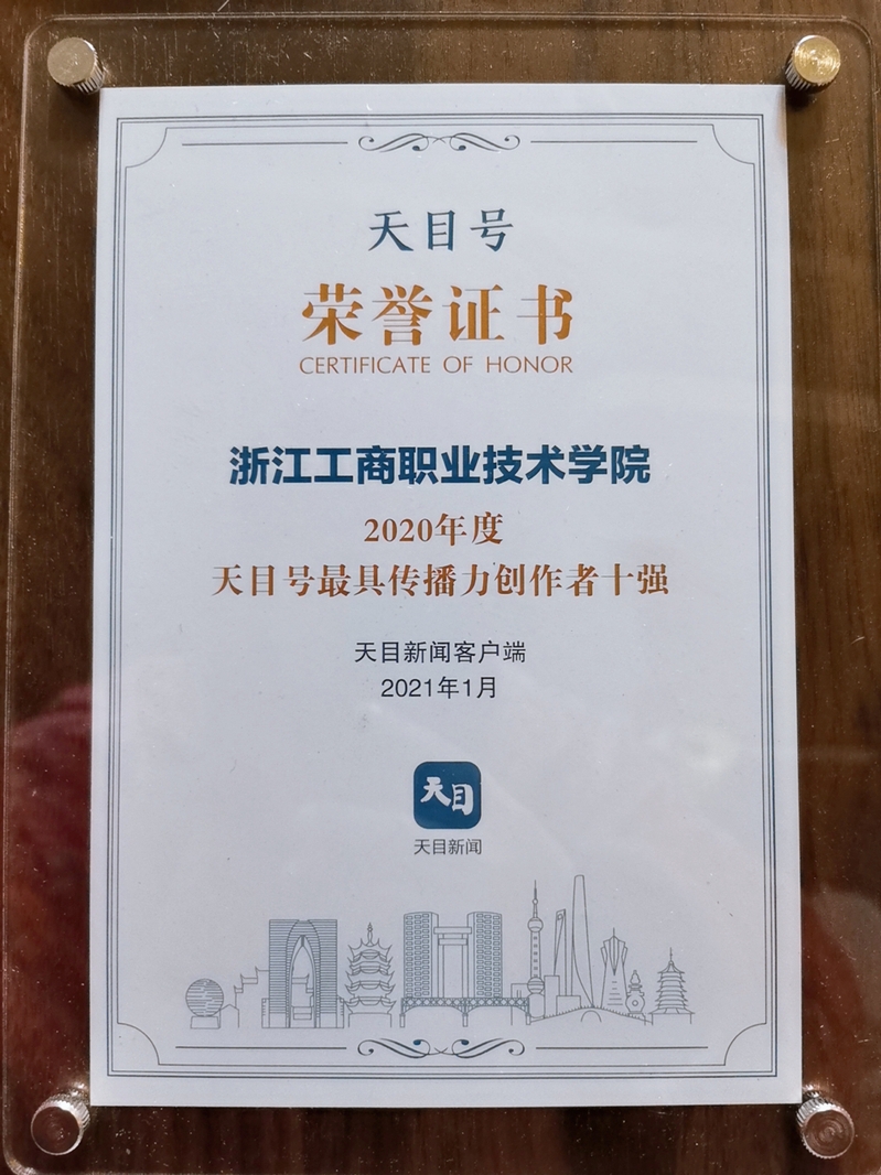 近日,由我校党委宣传部指导、全媒体中心运营管理的浙江工商职业技术学院天目号荣获“2020年度天目号最具传播力创作者十强”荣誉称号。
