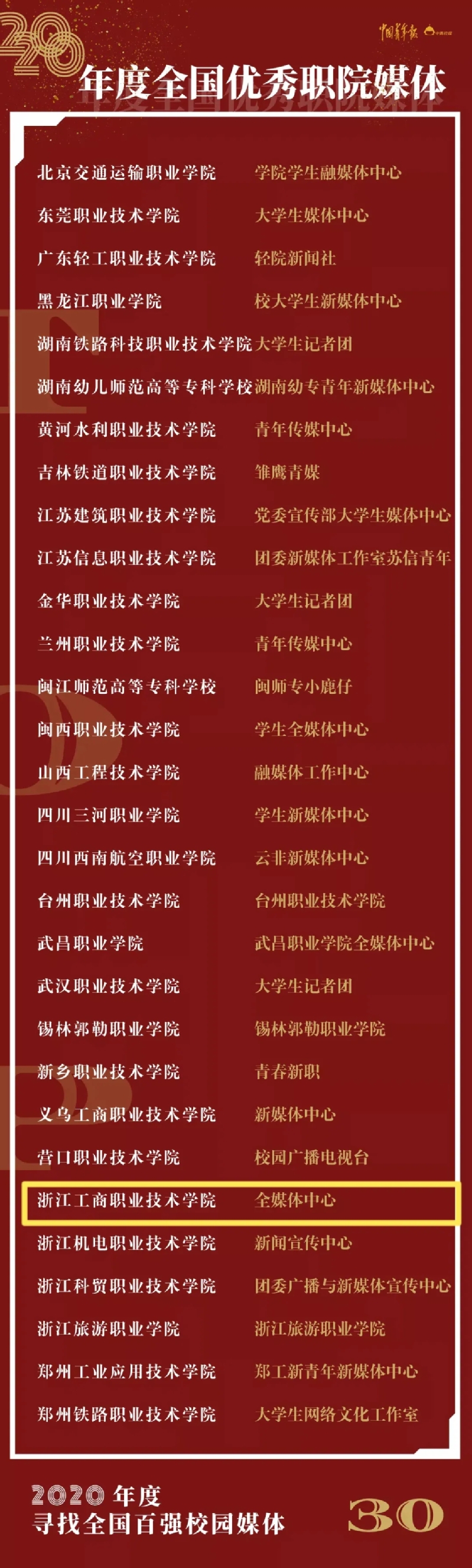 近日,涵盖全国高校最多、最权威的校媒排名、被誉为全国高校校园媒体最高荣誉的 “2020年度全国百强校园媒体”评选结果揭晓,我校全媒体中心凭借综合实力从全国高职院校中脱颖而出,荣获“2020年度全国优秀职院媒体”称号,成功入围“2020年度全国职业院校新媒体综合力30强”。