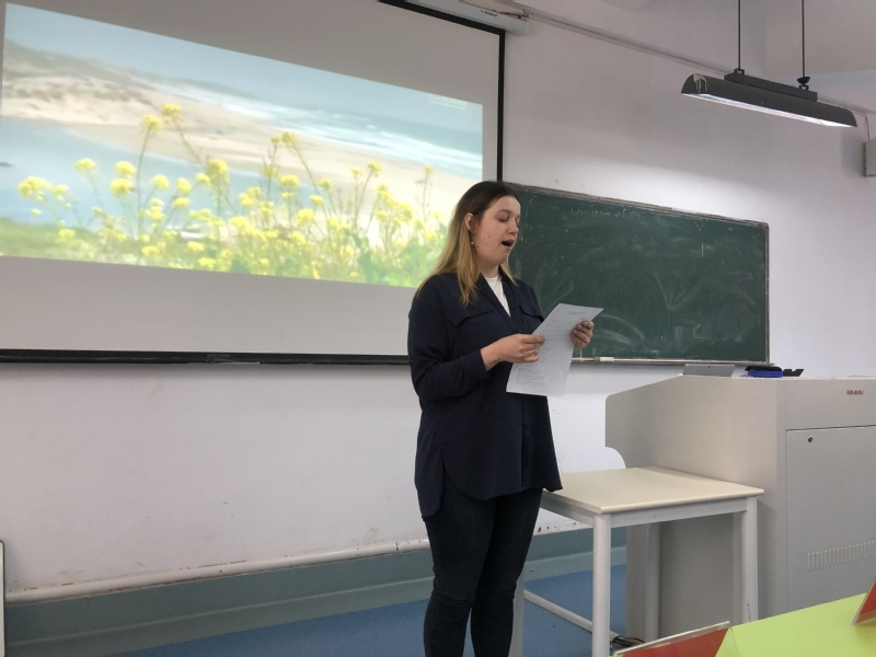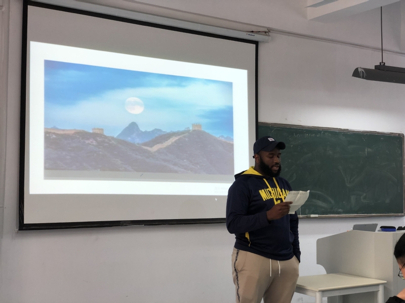 从海子的《面朝大海,春暖花开》到李白的《将进酒》,从欧震的《月光下的中国》到苏轼的《水调歌头》……13名留学生选手按组别依次上台,分别结合自己对这些诗文的理解,配上图片或动画背景,辅以相应的背景音乐,演绎着一个个经典作品。虽然每段诵读只有3-5分钟,但选手们投入的演绎得到了现场评委老师和观众们的阵阵掌声。最后,本次竞赛负责人贝可钧老师作了总结发言,认为这次比赛不论是评委、选手、观众,都收获了很大的Surprise(惊喜),希望大家能把对待比赛认真的态度,发扬到平时的学习中,提高自己的学业水平。