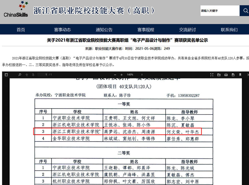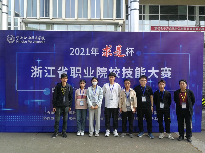 2021年浙江省职业院校技能大赛(高职)“电子产品设计与制作”赛项于4月30日在宁波职业技术学院举行,共有来自全省多所院校共有40支队120人参赛。我校应用电子技术专业学生高梦远、沈浩杰、周清源团队荣获一等奖。