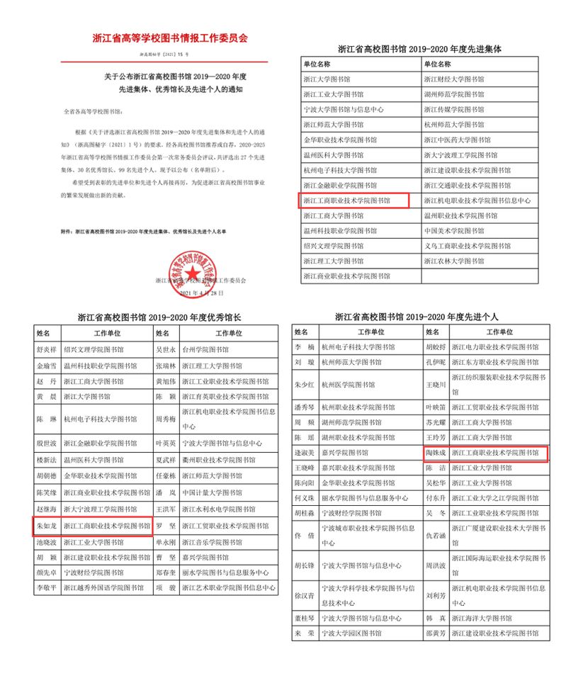 近日,浙江省高等学校图书情报工作委员会公布了2019—2020年度先进集体、优秀馆长、先进个人的名单,我校图书馆再次荣获“先进集体”荣誉称号,也是宁波市唯一获得该项荣誉的高职院校。校图书馆馆长朱如龙、校图书馆馆员陶姝成分别荣获“优秀馆长”和“先进个人”的荣誉称号。