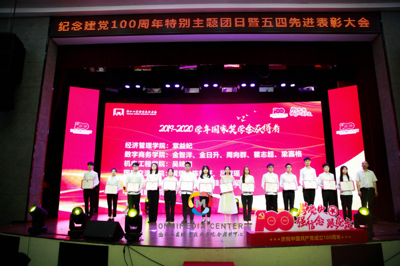 重唤入团初心,再燃拼搏激情。团员青年们高举右拳,在鲜艳的团旗下庄严宣誓,铿锵有力的誓词萦绕在现场每一位观众耳畔,展现了广大团员青年不忘初心跟党走、牢记使命勇担当的青春风采。在随后举行的颁奖仪式上,俞位增、谢骏,以及宣传部、学生工作部、团委负责人,各学院党总支(副)书记先后为2019-2020学年国家奖学金获得者、2020年度省高校团支部风采展示大赛优秀团支部、校优秀社团指导老师等颁奖。