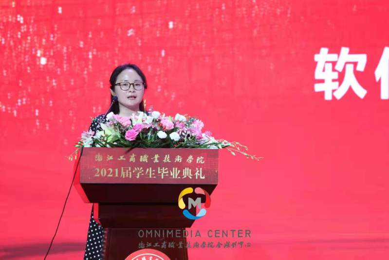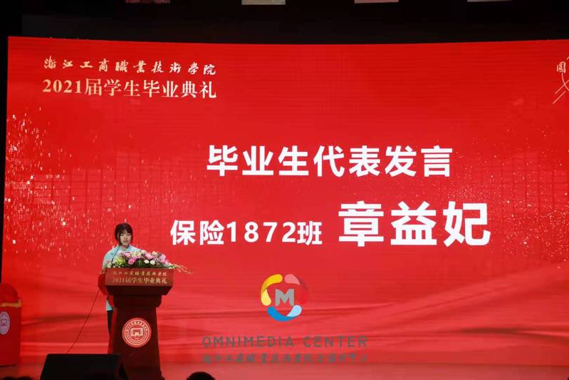 毕业生代表章益妃满怀不舍心情发言,对三年来在母校的生活学习做了回忆,提到无论是新冠疫情时期老师们身上诠释的工商精神,还是自己参加专业实践感悟宁波商帮精神,三年里的点点滴滴,欢乐或是青涩的过往,都是青春最好的高歌。