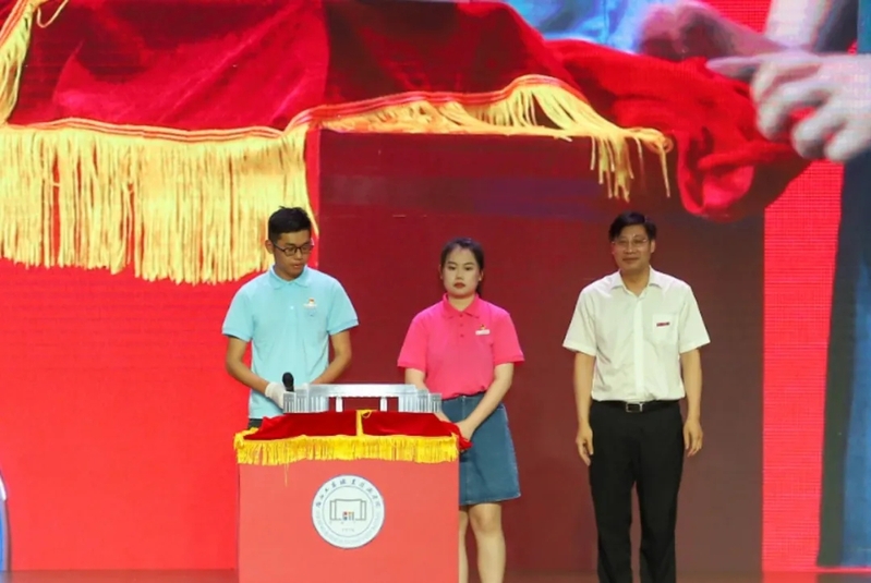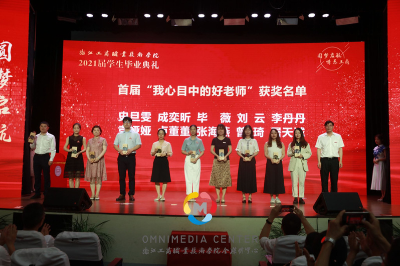 党委书记陈仕俊为10位首届“我心目中的好老师”颁发了奖杯,学生代表上台献花致敬。校长周志春为毕业班学生代表颁发毕业证书。