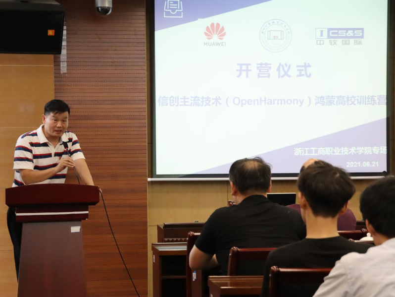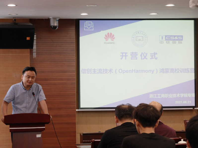 为了更好地推广普及信创产业主流应用技术,推动学校与园区、企业在产学合作、协同育人方面的深度合作,6月21日,浙江工商职业技术学院·中软国际鸿蒙应用开发训练营开营仪式在学校中和楼1007会议室举行,宁波软件园管理服务中心主任徐军、华为宁波中心负责人邹霆、中软国际教育科技集团(以下简称“中软国际”)浙江区总经理谢永刚,校党委副书记俞位增、电子信息学院及企业方相关负责人,鸿蒙应用开发训练营(一期)成员——软件专业近五十余名师生参加了仪式。