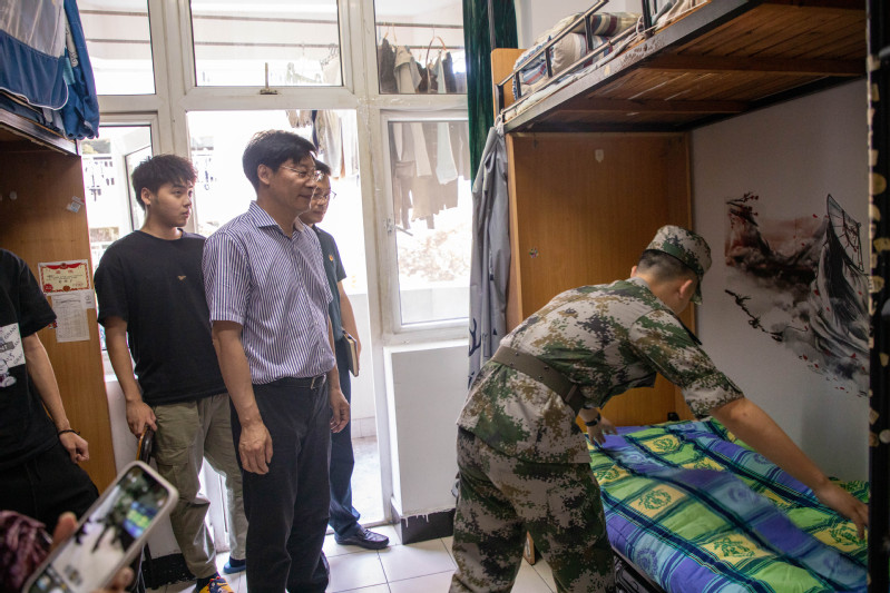 在学生寝室,陈书记看望了即将搬迁至宁海的机电工程学院大一学生,询问他们学习情况、社会实践安排等,叮嘱他们到宁海校区后要好好利用专业的实训室、专业的设备,不断提升自己专业学习的成效。在电子信息学院的学生寝室里,大一学生内务整理检查正在进行,学生教导队队员为师生演示了叠被子的要领。陈书记表示,青年学生要做好自身行为规范,寝室是一个检验良好行为习惯的重要场所,也是形成良好人际关系的重要场所,每位学生都要要把寝室“小家”建设好,让寝室成为成长的“精神家园”。