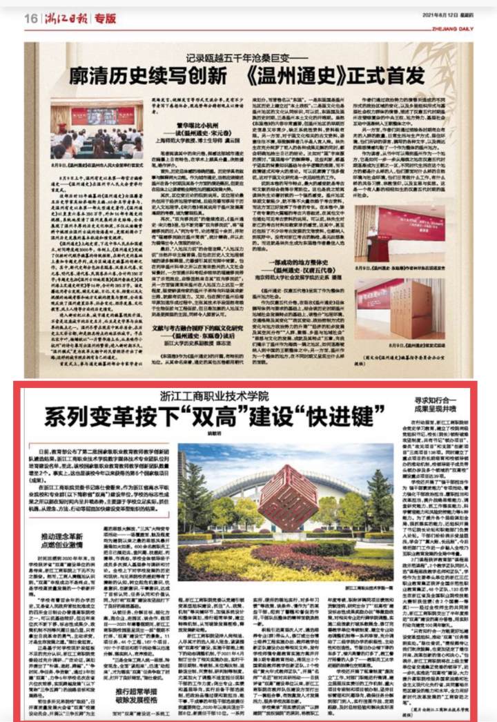 8月12日,《浙江日报》第16版刊出了题为《浙江工商职业技术学院 系列变革按下“双高”建设“快进键”》的文章,介绍了我校自获评浙江省“双高”建设单位以来,立足实际,抓住机遇,从理念、方法、行动等层面加快建设变革型组织,释放发展新动能,标志性成果呈井喷态势的内容。浙江新闻客户端、《宁波日报》等重要媒体也相继对此做了报道,在提升学校知名度、美誉度的同时,更为我校凝心聚力、改革创新,扎实推进“双高校”建设,向着“三争五跨”目标奋力迈进营造了积极振奋的舆论氛围。