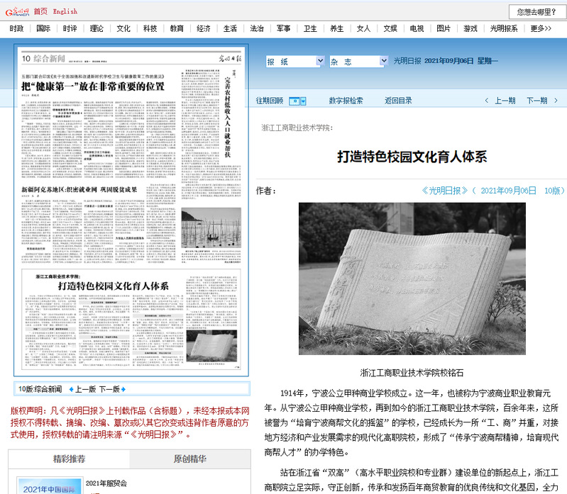 2021年9月6日,《光明日报》(10版:综合新闻)刊出了《浙江工商职业技术学院:打造特色校园文化育人体系》的文章,介绍了我校立足“双高”建设新起点,从学校文化育人的现状出发,整合现有文化资源,锚定“承续与发展”方向,构建“一三三三”特色校园文化育人体系的做法。《中国教育报》等重要媒体也相继对此做了报道,在提升学校知名度、美誉度的同时,更为我校不断提升文化自觉、增强文化自信,全力推进“铸魂育人”工程,加快双高校建设营造了积极振奋的舆论氛围。