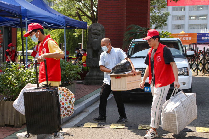 为了做好疫情防控工作,给同学们提供良好的报到体验,学生工作部、团委以及各二级学院组建了学生志愿者队伍并提前进行了培训。1600人次志愿者以“一对一或一对多”的方式做好学生进校扫码、查验行程码、体温测量、行李消毒等工作,他们帮忙搬运的行李、用湿的手套、给电动车充电的次数都不计其数,鲜艳的红马甲、文艺的小布包成为初秋校园里的靓丽风景线。此外,学校还安排了大巴车分别前往宁波火车站(汽车南站),宁海火车站、客运中心等迎接新生们的到来。