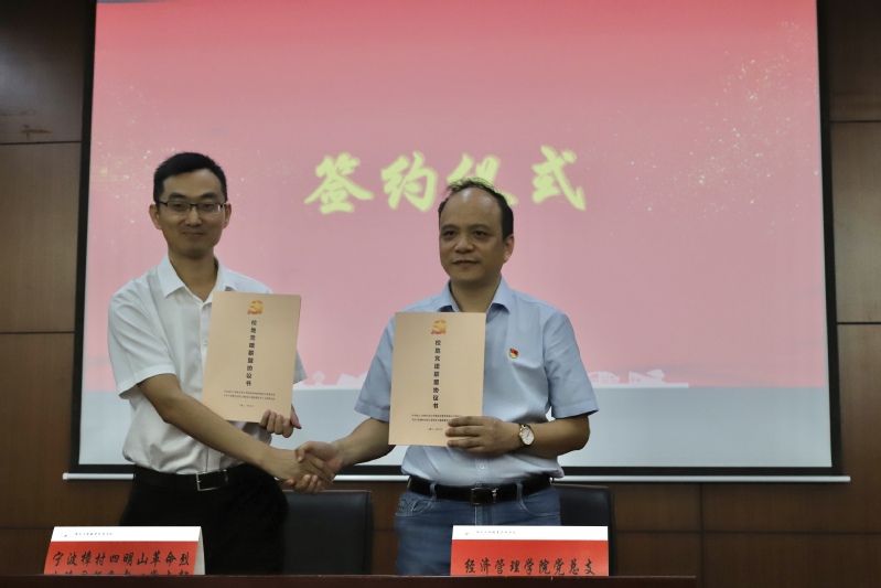 活动中,陈军强为七名宣讲员颁发了学校“德育导师”聘任书。经济管理学院党总支书记励业与宁波樟村四明山革命烈士陵园服务中心党支部书记陈志斌现场签订了“党建联盟”协议,希望通过党建结对共建,充分发挥双方优势,利用红色教育资源,实现优势互补、资源共享、党员共育、组织共建,努力将校地合作推向更深层次和更广领域。陈志斌还向我校学生党员代表赠送了党建书籍。