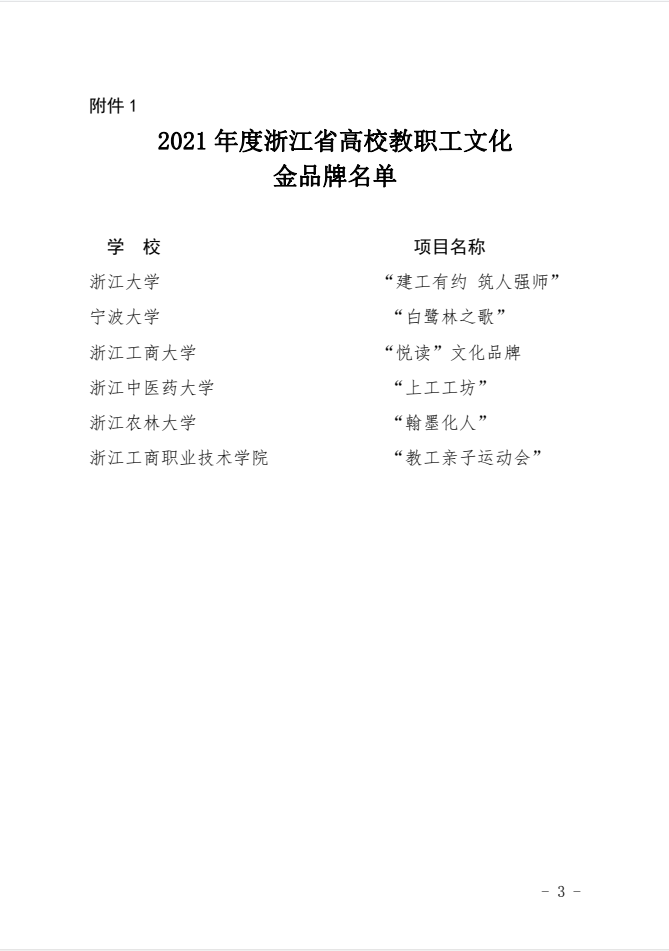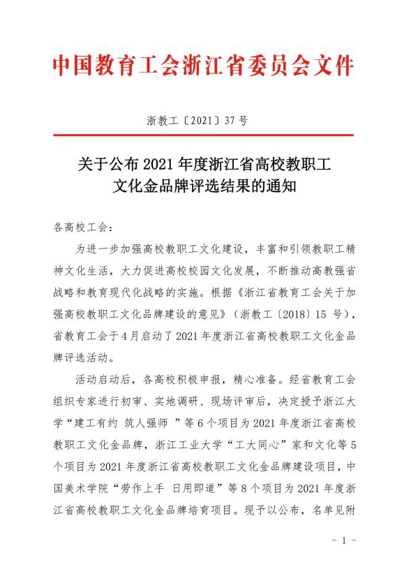 据悉,浙江省高校教职工文化金品牌评选活动系首次举办,申报学校及项目规模大且品质精,经专家初审、实地调研、现场评审等环节,最终我校“教工亲子运动会”等6个项目入选金品牌;浙江工业大学“工大同心”家和文化等5个项目为金品牌建设项目;中国美术学院“劳作上手日用即道”等8个项目为金品牌培育项目。校工会将以此次金品牌评选活动为契机,进一步扩展该项活动的参与面,丰富并创新活动形式与载体,专注于创设温馨融洽的家庭环境与和谐愉快的工作氛围,为学校高水平高质量发展及“十四五”建设添砖加瓦。