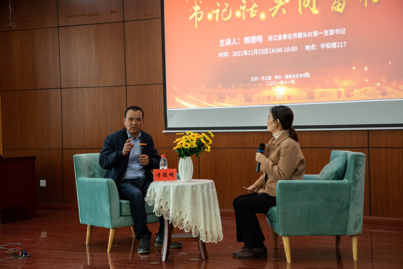 为深入学习贯彻习近平新时代中国特色社会主义思想,全面落实立德树人根本任务,在学生中开展社会主义核心价值观教育,由学工部主办、建筑与艺术学院承办的我校第37期厚德讲坛暨“书记话共同富裕”近日在中和楼217举行,滕头村第一支部书记傅德明、外宣办副主任傅丹丹,建筑与艺术学院党总支副书记、院长徐健民,宣传部部长陈军强、学工部副部长赵进军,以及学院辅导员、学生代表等参加了本次活动。本次讲座由建筑与艺术学院党总支副书记郭瑞涛主持。
