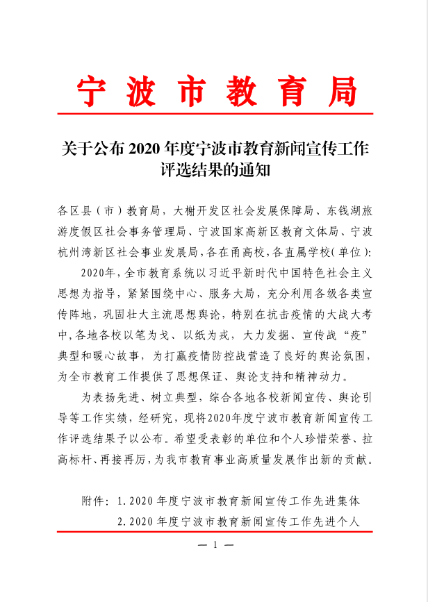 近日,根据宁波市教育局《关于公布2020年度宁波市教育新闻宣传工作评选结果的通知》,我校获评2020 年度宁波市教育新闻宣传工作先进集体,学校官博获评2020 年度宁波市教育优秀新媒体,同时,我校姚敏明老师获评2020年度宁波市教育新闻宣传工作先进个人。