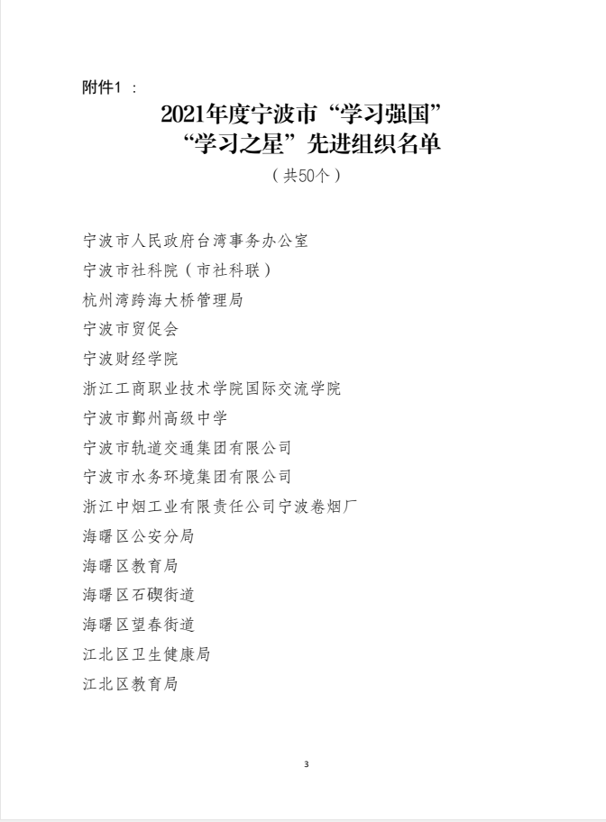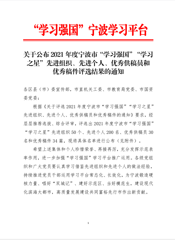 近日,根据“学习强国”宁波学习平台《关于公布 2021 年度宁波市“学习强国”“学习之星”先进组织、先进个人、优秀供稿员和优秀稿件评选结果》的通知,经层层推荐选拔、综合评审,我校国际交流学院党总支获评宁波市“学习强国”“学习之星”先进组织。