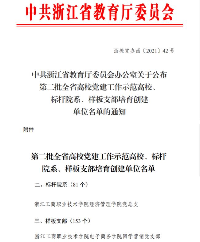 近日,中共浙江省教育厅委员会办公室公布了第二批全省高校党建工作示范高校、标杆院系、样板支部培育创建单位名单,我校经济管理学院党总支获评“标杆院系”创建单位、电子商务学院团学营销党支部获评“样板支部”创建单位。