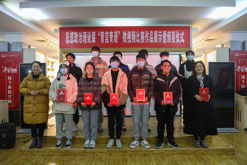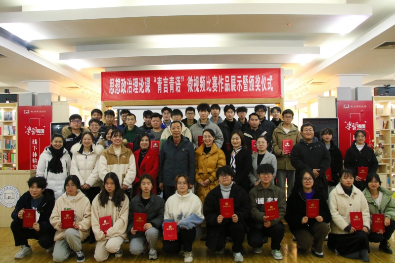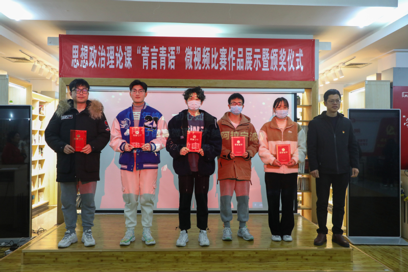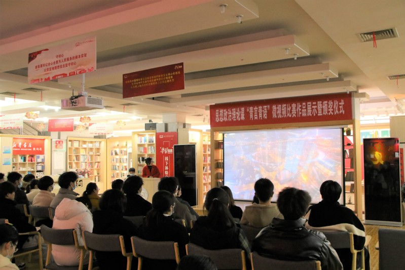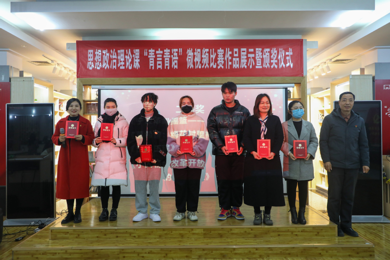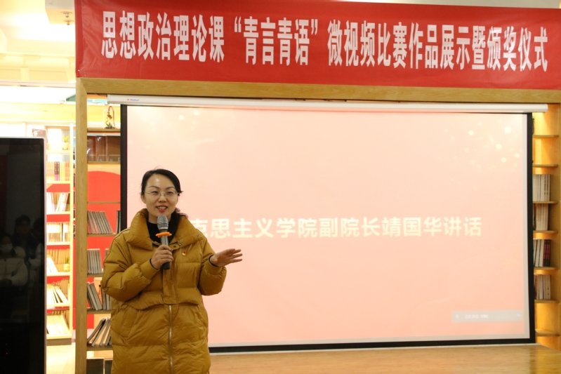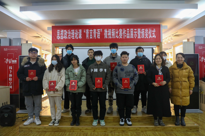 2021年12月29日下午,微视频比赛作品展示暨颁奖仪式在图书馆一楼举行。宣传部部长陈军强、明智学院院长温江霖、马克思主义学院副院长(主持工作)靖国华、指导教师代表、获奖学生代表等参加了颁奖仪式。本次活动由概论教研室主任朱伟主持。陈军强在讲话中充分肯定了此次活动的积极意义。他指出,学校采取有力措施认真贯彻落实党中央关于思政课创新发展的决策部署,思政课教学效果逐年提升,课程建设取得了显著成效。此次微视频比赛是思政课一次有效的教学实践。希望马克思主义学院能以更为丰富多彩的活动为契机,不断深化思政课教学改革和方法创新,加大实践教学改革力度,增强教学的鲜活性,助力学生成长成才。