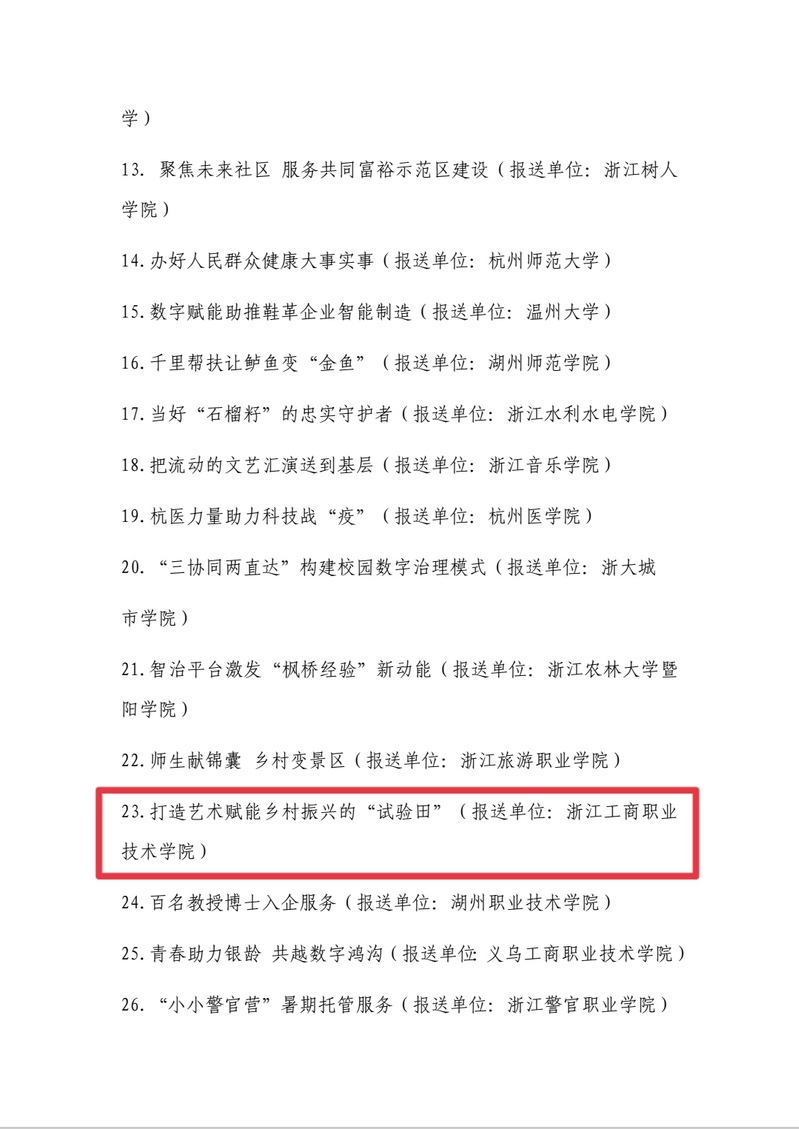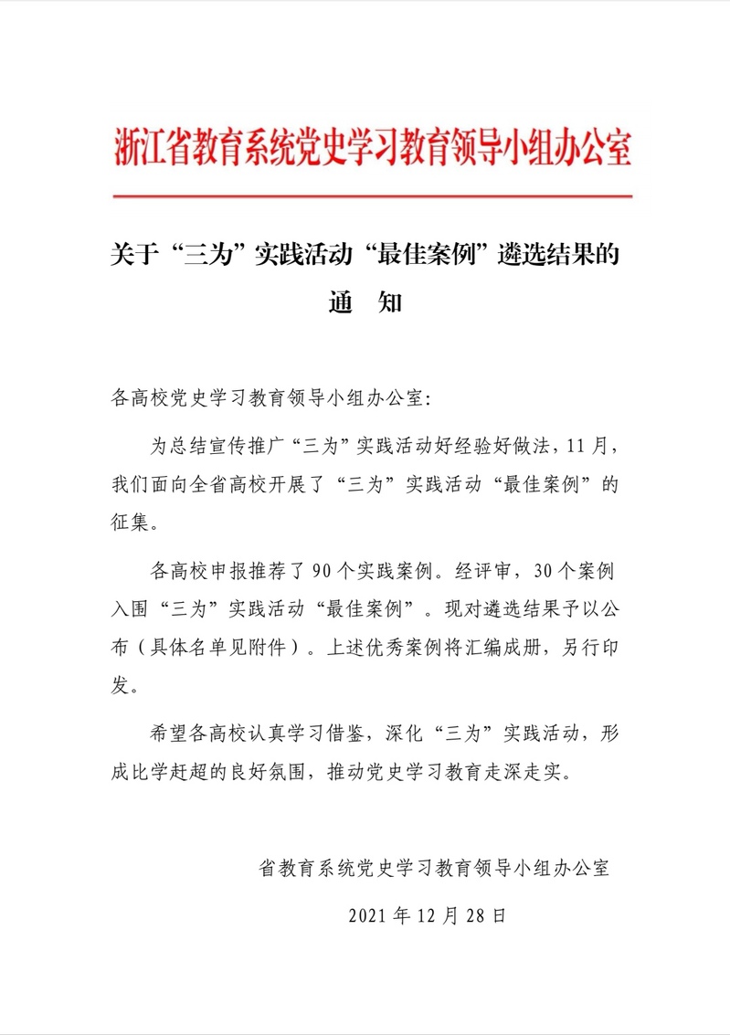 为总结宣传推广“三为”实践活动好经验好做法,省教育系统党史办于2021年11月面向全省高校开展了“三为”实践活动“最佳案例”的征集,经过各高校申报推荐,省教育系统党史办组织评审,最终有30个案例入围“三为”实践活动“最佳案例”,并汇编成册印发至全省高校。我校报送的案例《打造艺术赋能乡村振兴的“试验田”》概括凝练了建筑与艺术学院党总支坚持党建和中心工作的互融发展,党员师生发挥专长,积极参与完成与东钱湖管委会的校地合作项目,助力乡村振兴的经验做法,彰显了职业院校在高质量发展建设共同富裕示范区、先行市中的责任与担当。
