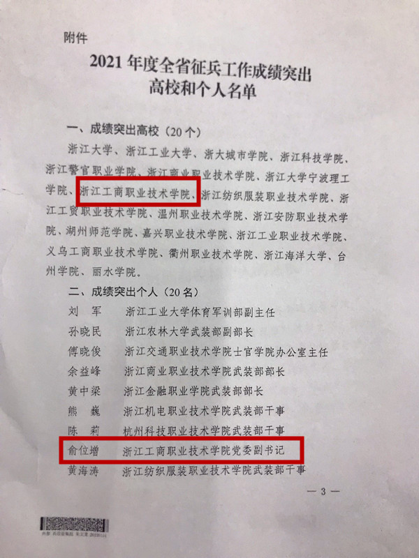 近日,浙江省人民政府征兵办公室、浙江省教育厅印发了《关于表扬2021年度全省征兵工作成绩突出高校和个人的通报》(浙征[2022]2号),我校再次荣获“全省征兵工作成绩突出高校”,党委副书记俞位增荣获“全省征兵工作成绩突出个人”。