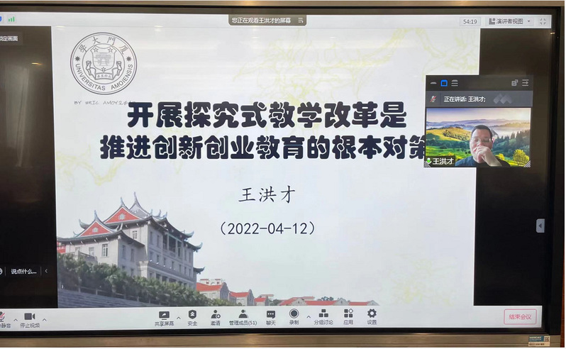 为促进学校创新创业教育深入开展,探索创新创业教育方法改革,提升教师创新创业教学能力,4月12日下午,学校特邀请厦门大学教育研究院副院长王洪才教授作“双创”教育专题报告。因疫情防控要求,报告会分线下与线上二个会场,党委委员、副校长徐盈群,党委委员、纪委书记张启富,教务处负责人、各学院院长、各基层教学组织负责人等在线下参会,其他二级学院领导和教师在线上参会。