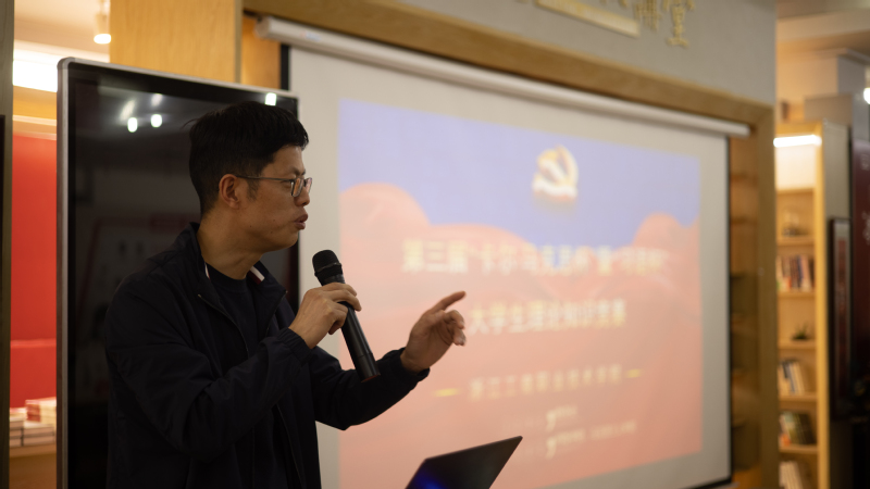 陈军强为本次活动致辞,他指出青年大学生应当主动培养自身的学习精神,不断加强理论学习,以进一步提高政治素养。同时指出,本次活动的举办对我校下半年参与浙江省第五届“卡尔·马克思杯”大学生理论知识竞赛具有较好的宣传和推动作用,并对入围决赛的选手提出了更高的要求,一方面是通过参与本次竞赛,自身的学习能力、理论素养等获得一定提升,另一方面应当发挥自身的辐射力,将竞赛的精神传播给身边的同学,为我校入围省赛夯实基础,贡献力量。