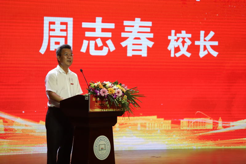 校长周志春作毕业致辞。他代表学校对4467名2022届毕业生表示热烈的祝贺和诚挚的祝福,回顾了三年来和学生们的点滴相处:2019级学生开学典礼上的温情互动,三年后仍心系学生们的毕业去向;抗击疫情期间与学生们畅谈责任和担当,鼓励学生要努力做到思想精神强、科学知识强和技术本领强;校长面对面活动中解答学生们的疑惑,和学生分享成功的意义,幸福的定义。他说到,回首三年,同学们克服了许多困难,从大家身上看到了新时代青年无畏有为的青春模样,特别感谢大家对母校的包容与热爱,伴随学校一起成长、发展。他指出,每位毕业生都是“工商”的缩影、化身和代表,都是“工商”精神、“工商”校训、“工商”文化的继承者、发扬者和传播者,希望大家永远爱党爱国、勤勉学习、诚实守信、实干笃行,不管走到哪里,不管从事什么职业,都要把家国情怀作为自己最重要的担当;要继续学习,把终身学习作为一种习惯,不断锻造自己的职业核心竞争力;要说真话、干真事、做真人,控得住操行、管得住欲望、守得住底线;要脚踏实地,不驰于空想,不骛于虚声,以实干精神浇开梦想之花,在实干的青春中成就事业华章。