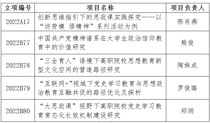 我校共有5项课题从全省41所高职院校推荐的296项课题中脱颖而出,获得立项(其中重点项目1项、一般项目4项),立项总数排名全省第四名。具体立项名单如下: