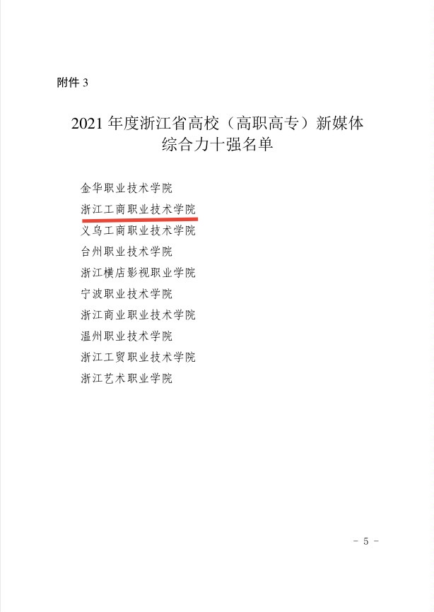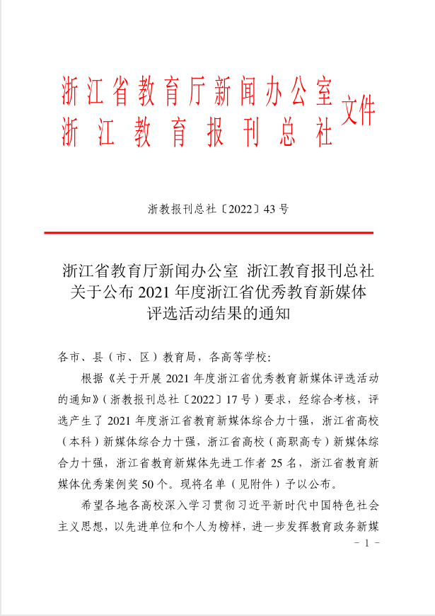近日,浙江省教育厅新闻办公室公布了《关于公布2021年度浙江省优秀教育新媒体评选活动结果的通知》,我校首次荣获2021年度浙江省高校(高职高专)新媒体综合力十强,并位列第二,这是我校继连续两年获得“浙江省十佳校园媒体”、“浙江省高校新媒体优胜奖”,连续三年获得“浙江省教育新媒体创新奖”之后,为学校新媒体工作新添的一项综合荣誉。