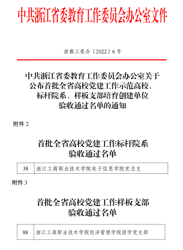 近日,中共浙江省委教育工委公布首批全省高校党建工作示范高校、标杆院系样板支部培育创建单位验收通过名单,我校电子信息学院党总支、经济管理学院团学党支部顺利通过首批全省党建工作标杆院系、样板支部培育创建工作验收。