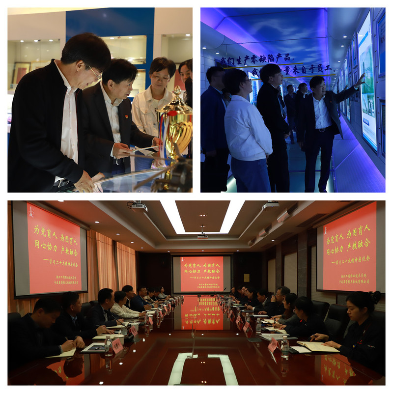 在宁波星箭航天机械有限公司,陈仕俊一行在公司董事长、党委书记严国元的热情陪同下,实地参观了企业党建文化室、产品展厅,并在企业召开以“为党育人、为国育才,同心协力、产教融合”为主题的学习贯彻二十大精神座谈会。座谈会上,严国元、陈仕俊分别介绍了双方发展历程和发展情况,并围绕创新驱动、质量致胜、人才强企强校、专业技术合作、学生实习就业、党建共同体建设等内容开展交流。双方还举行了优秀就业实践基地授牌仪式。宁波星箭航天机械有限公司系国家级“专精特新”小巨人企业,是一家致力于军工科研、生产配套的民营高新技术企业,一直为“星、箭、弹、机、舰”生产相关配套设备,系宁波军民结合产业促进会发起单位。