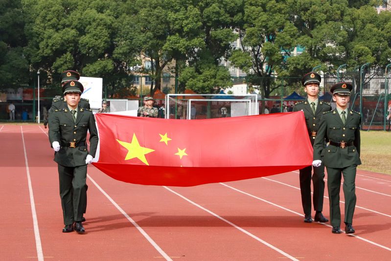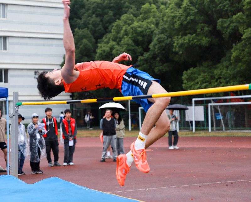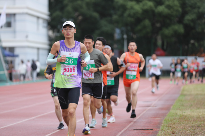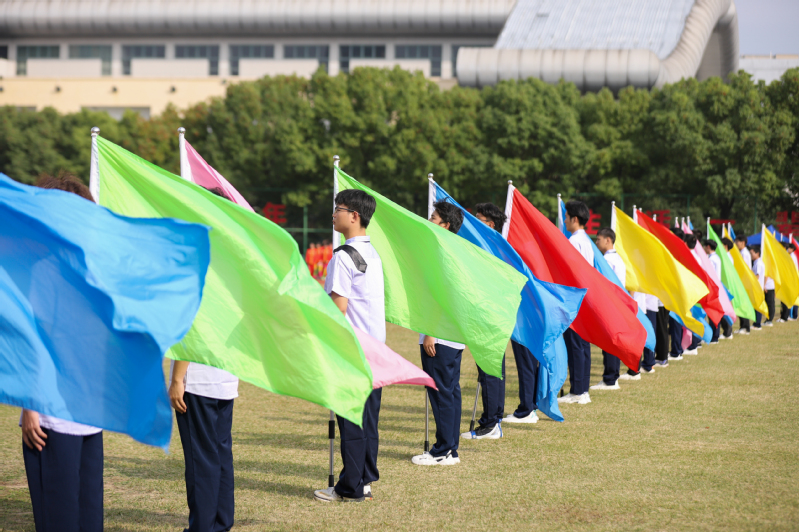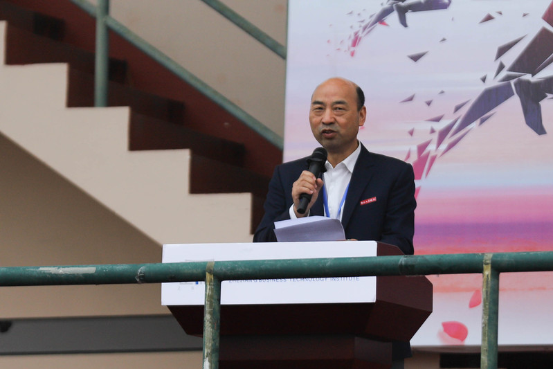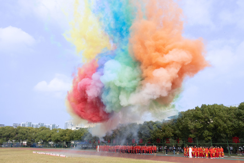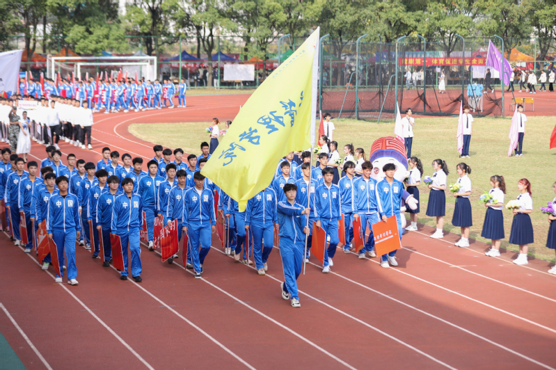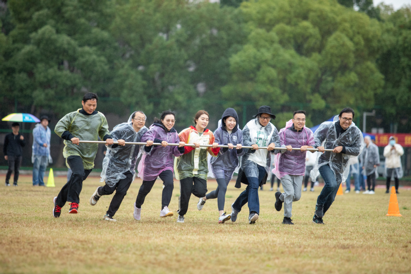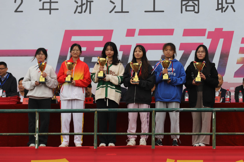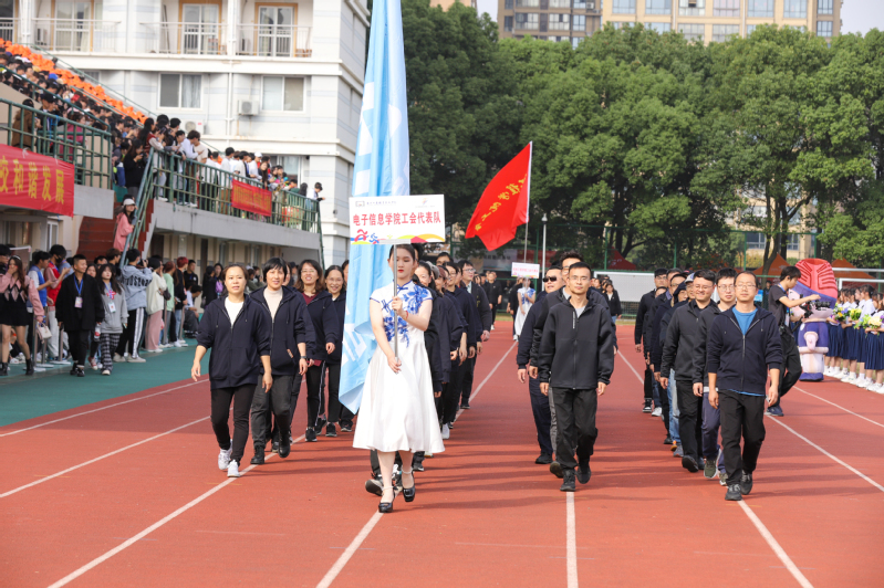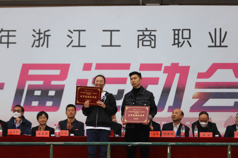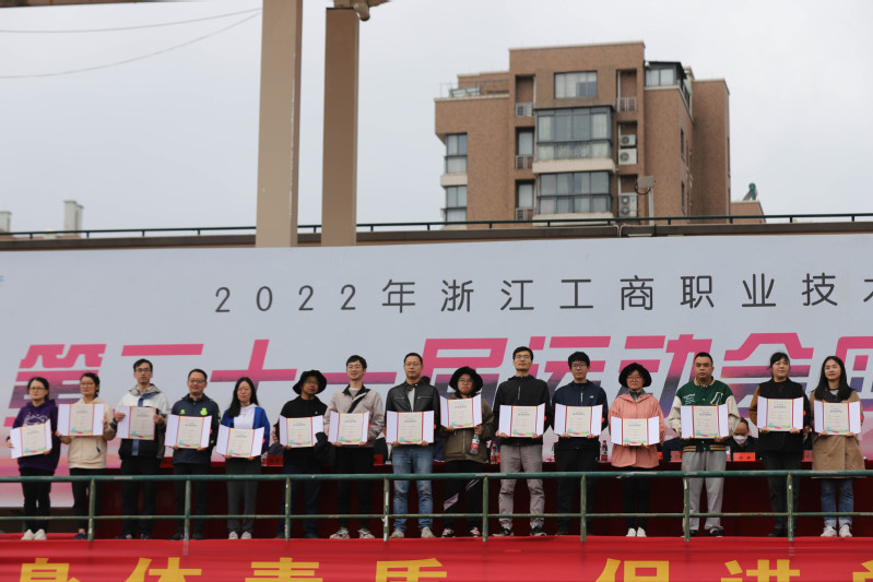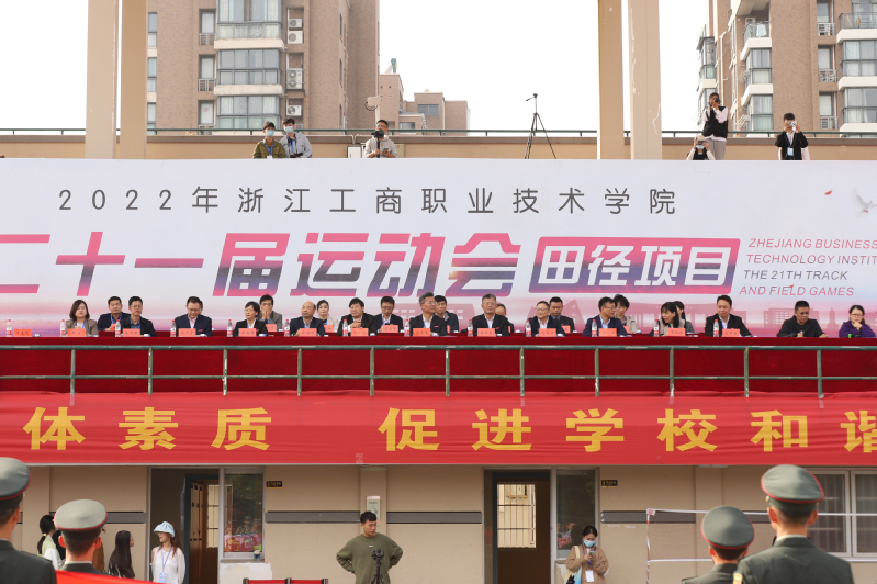 陈仕俊宣布第二十一届运动会开幕。本届运动会全校共有14支代表队共909名运动员参加了激烈的角逐,其中学生运动员 638名,教工运动员271名;共设置了男女各19个竞赛项目,其中学生组竞赛项目36个,教工组竞赛项目16个(含趣味项目)。开幕式上,国旗护卫队、会徽护卫队目光坚毅、步伐整齐;鲜花队、彩旗队神采飞扬、活力四射,吉祥物“小商”热情洋溢、活泼可爱;裁判员方阵和各个学院的方阵,精神抖擞、整齐划一;主席台前的展示表演精彩纷呈,体现出鲜明的时代气息和昂扬的精神风貌。伴随着一声巨响,日景烟火五光十色、直上云霄,把现场的气氛点燃!学生武术俱乐部带来了教改项目的成果展演,他们的战旗波涛起伏,在场上呈现出“二十大”的造型,代表新一代大学生勇担使命、上心同心、奋力拼搏,象征我们的队伍永远向前、向前、向前!随后进行柔力球俱乐部教改项目的展演,整齐的着装,柔美灵巧的动作,引来掌声阵阵。我校现为浙江省高校中首开柔力球运动必修课程的高等院校,为丰富师生校园生活、提高师生身体素质,助力“全民健身”国家战略目标提供了很好的示范效应。现场还进行了第九套广播体操的表演赛,整齐有序的队列、矫健有力的动作充分彰显了工商学子朝气蓬勃、奋发向上的青春风采。
