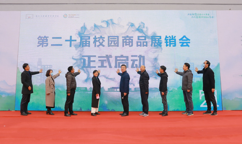 校领导、相关部门负责人共同按动启动按钮,周校长宣布第二十届校园商品展销会开幕。