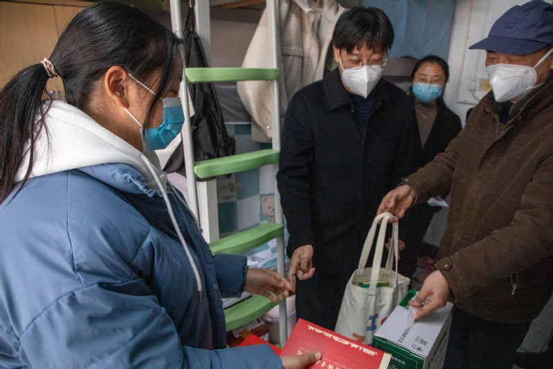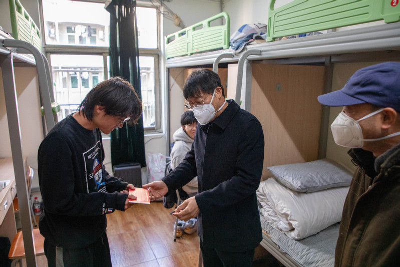 陈仕俊一行先后走访了学生宿舍一号楼、二号楼和六号楼的部分寝室,每到一处,学校领导与学生们亲切交谈,仔细询问学生的学习、生活、疫情防控和返乡情况,详细了解学生的实际困难和需求,及时回应学生关切和合理诉求,并为学生发放了慰问金、暖心礼包和防疫大礼包。寝室里充满欢声笑语,暖意融融。