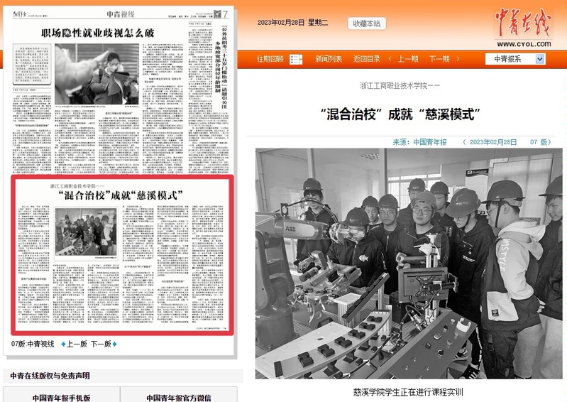 2023年2月28日,《中国青年报》07版(中青视线)以二分之一版面,大篇幅报道了题为《浙江工商职业技术学院:“混合治校”成就“慈溪模式”》的文章,介绍了我校与慈溪市人民政府合作共建慈溪学院,实现“高技能人才落户慈溪、高质量服务面向慈溪、高端培训落地慈溪、高层次人才关爱慈溪”的“四高”变化,形成“产权混合、责任分担、利益分享、育人协同、服务共献、市域驱动”的“混合治校”“慈溪模式”的内容,充分展示了探索混合所有制办学的“工商经验”,提升了学校美誉度,扩大了社会影响力,为“双高”建设的纵深推进营造了积极振奋的舆论氛围。