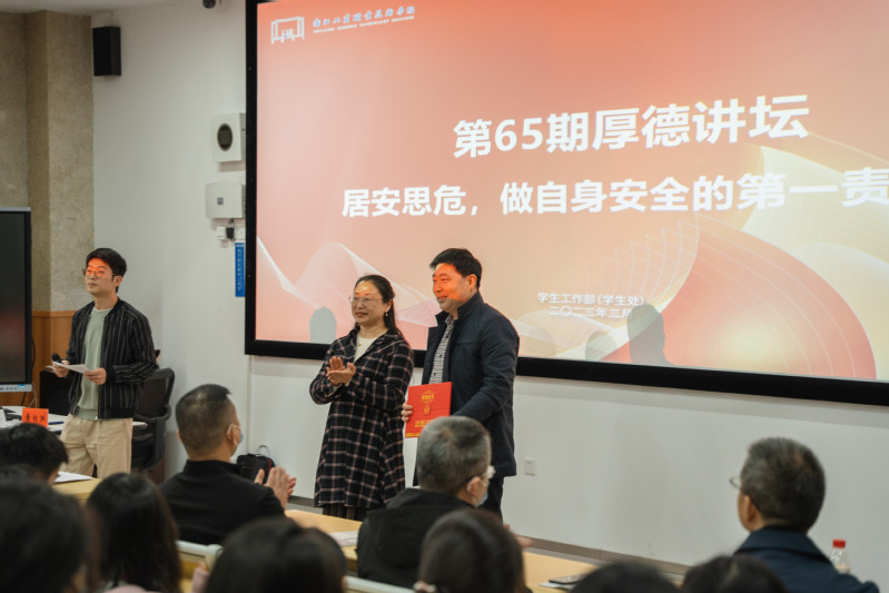 3月16日下午,我校第65期厚德讲坛《居安思危,做自身安全的第一责任人》在思齐楼22C3教室顺利举行。学工部副部长、学生处副处长董艳为主讲嘉宾海曙区应急管理局副局长、党委委员童祖洪颁发了德育导师聘书。