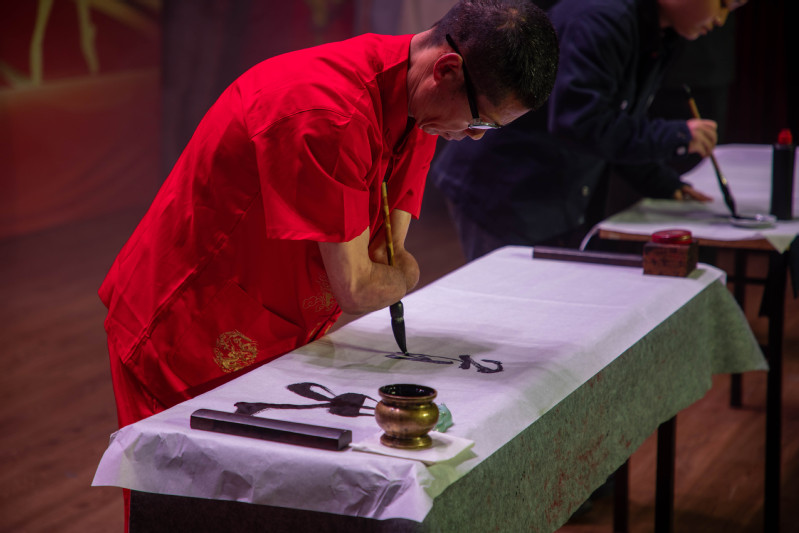 在现场书法表演环节,来自我校书法协会的张冉婧(软件2222班)同学与姜先生同台展示,“爱党爱国爱校”抒发了青年学子的炙热情怀,“天道酬勤”表达了有志者事竟成的决心和毅力。艺术团将书法作品赠予工商,激励工商学子发奋图强。