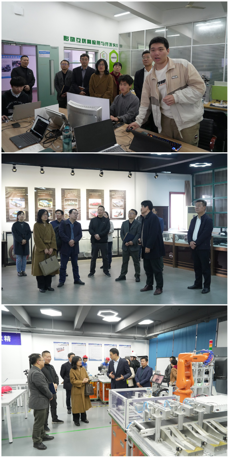 专家组一行在周志春等陪同下实地考察了电子信息学院软件与大数据实训中心等,专家们对我校三全育人改革、现代学徒制培养模式、数字校园建设等取得的成效给予高度赞誉。